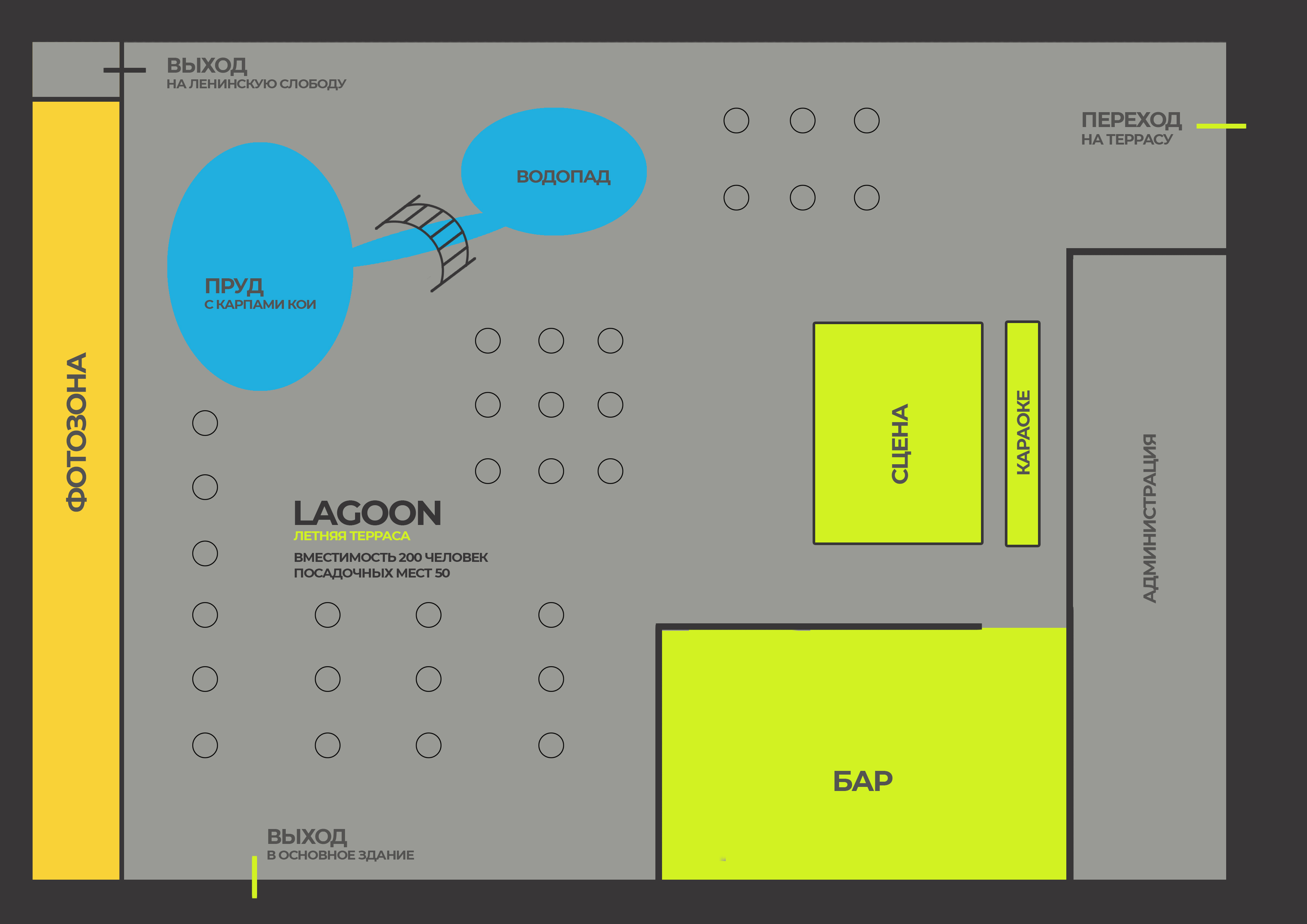 Вместимость зала 450 человек, посадочные места на 120 человек. Танцпол, бар.